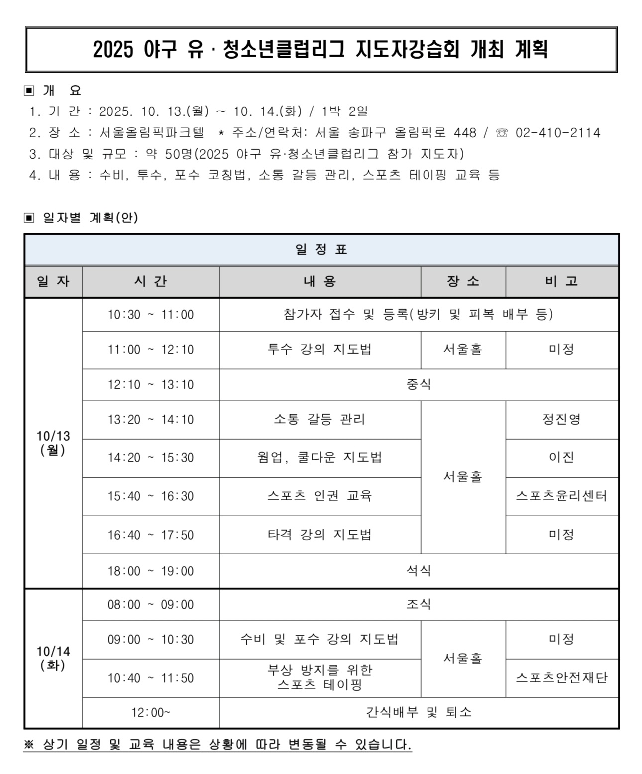 10.13(월)~14(화)(1박 2일) ‘2025 야구 유청소년클럽리그 지도자 강습회’를 개최합니다.