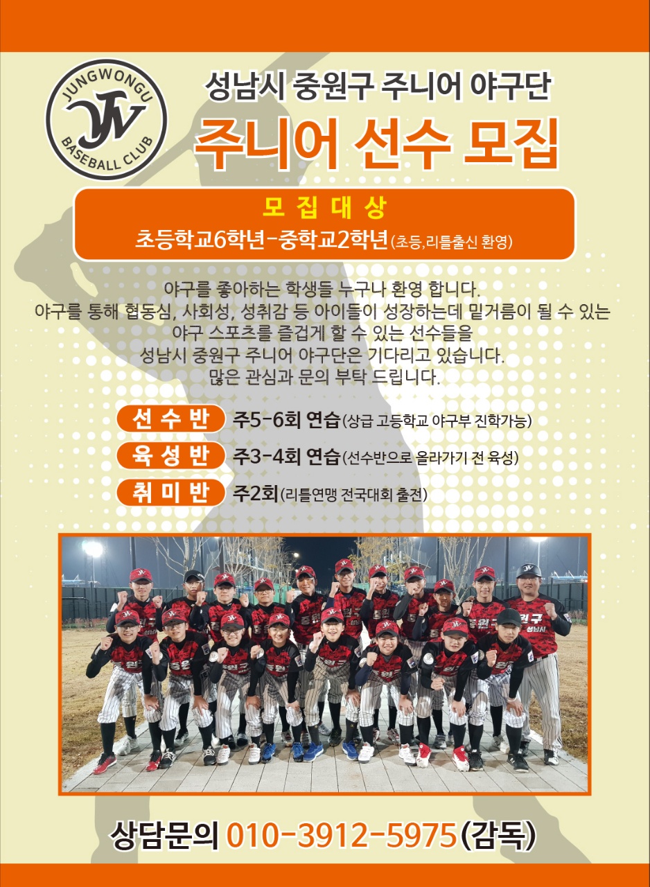 성남시 중원구 주니어 야구단에서 즐겁게 야구 할 신입 선수를 모집합니다.